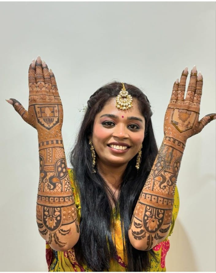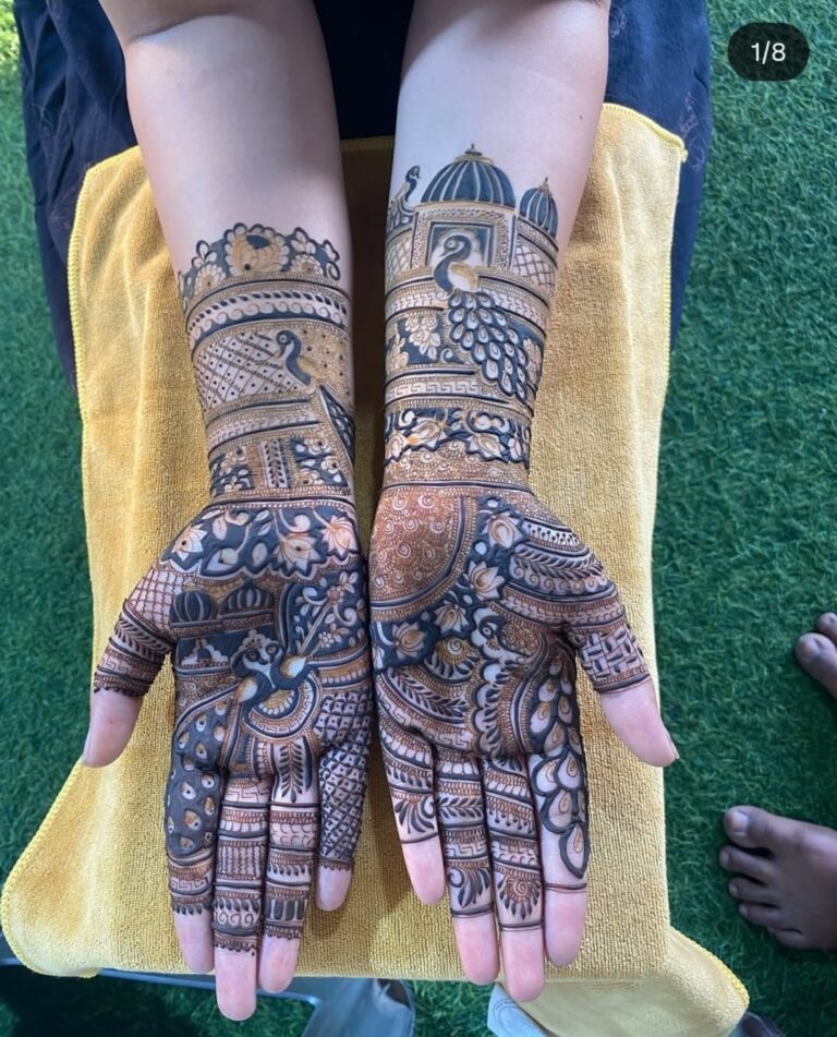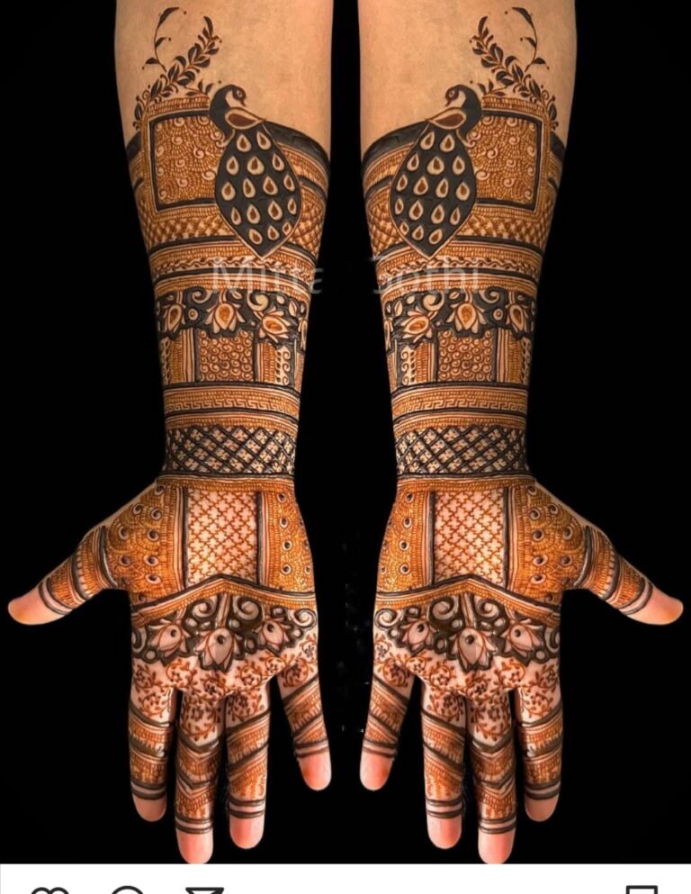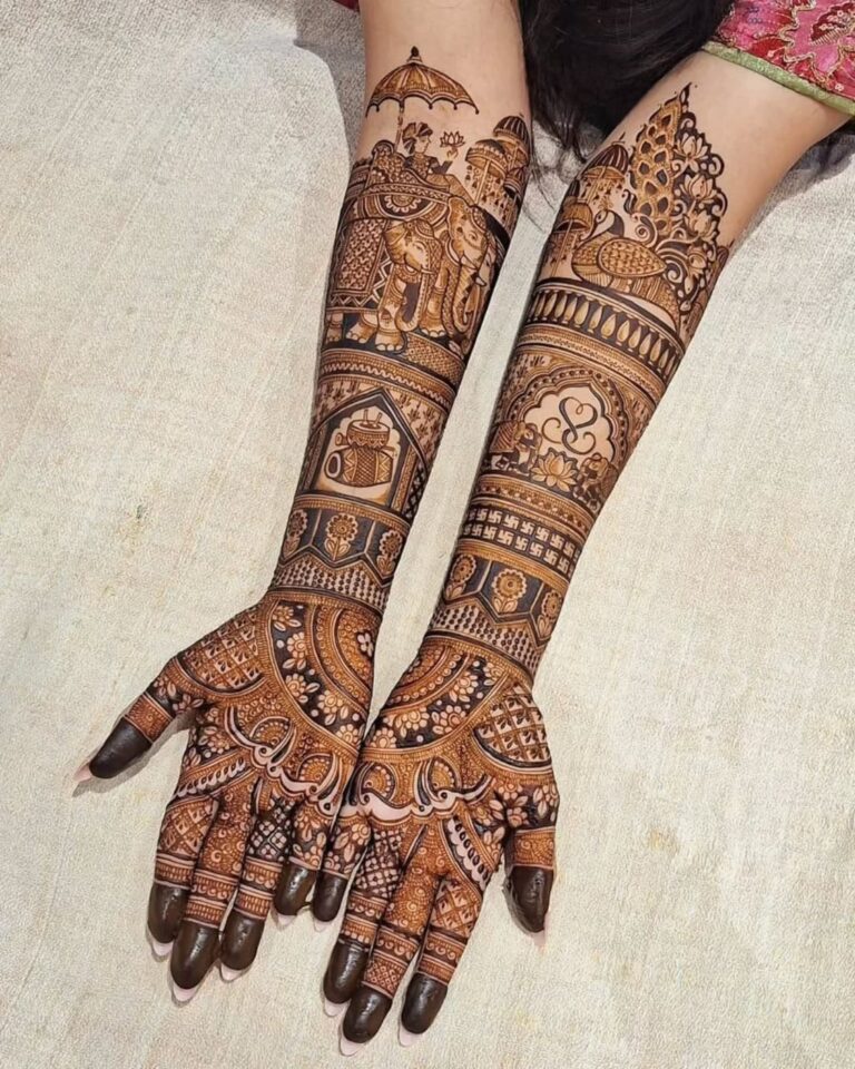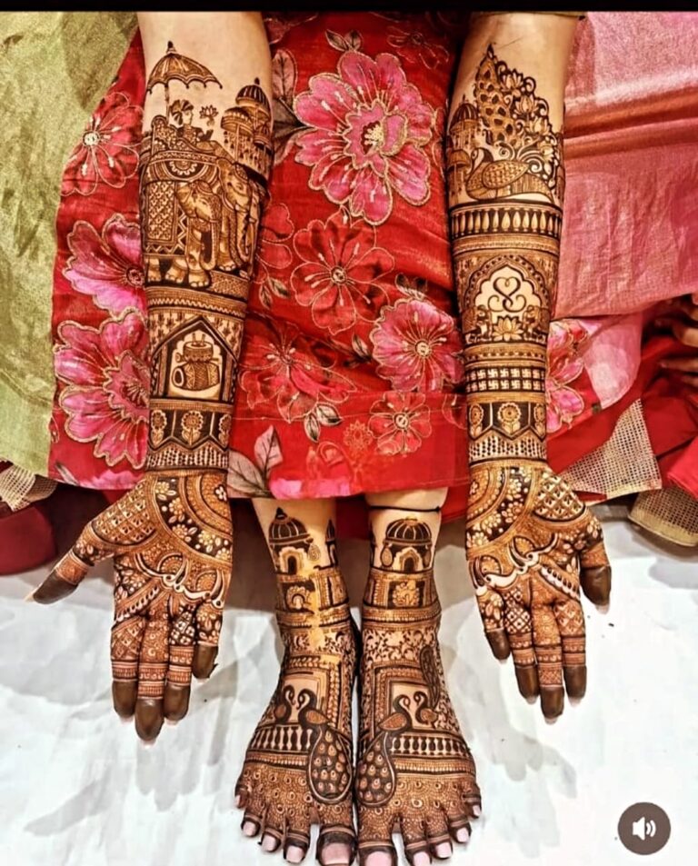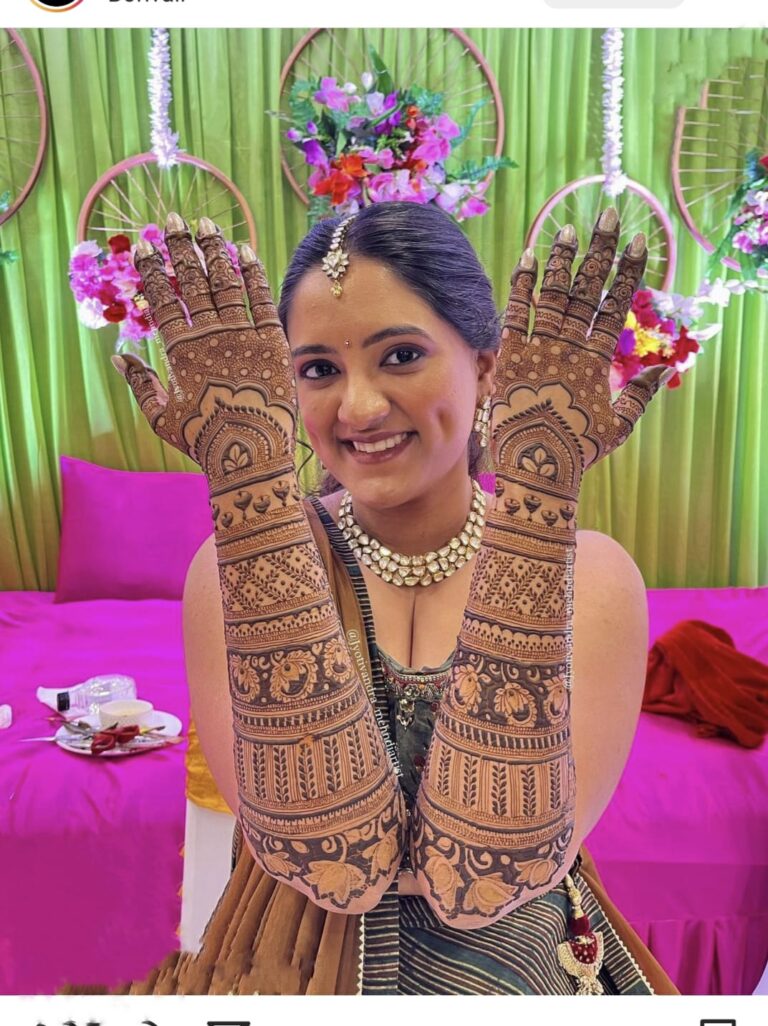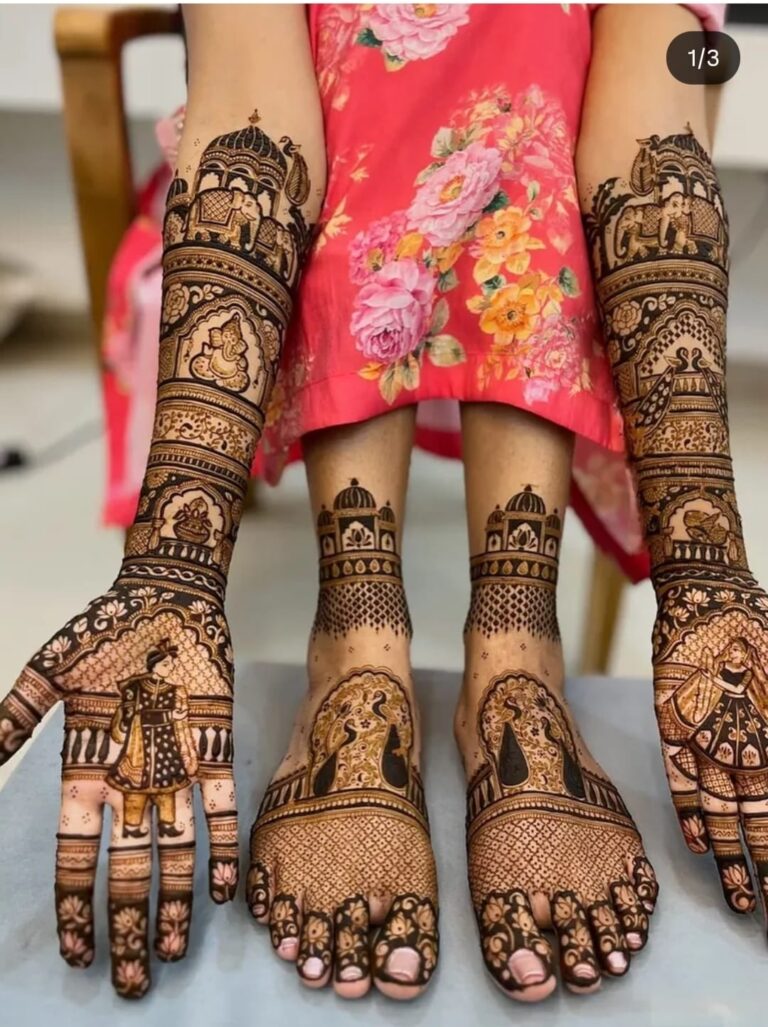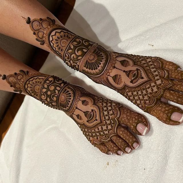 It often includes traditional motifs like paisleys, florals, mandalas, and symbolic elements. These designs cover the hands and feet beautifully, representing love, prosperity, and new beginnings.