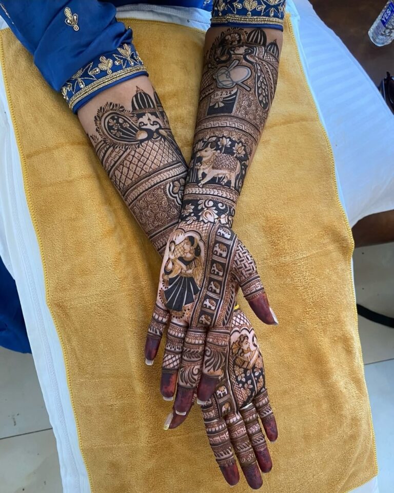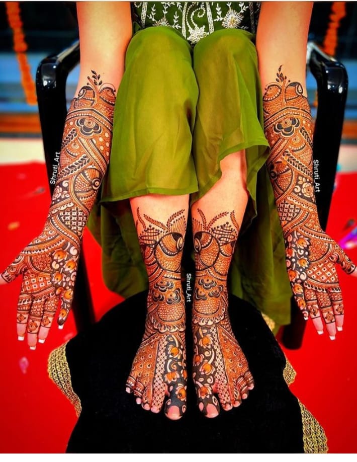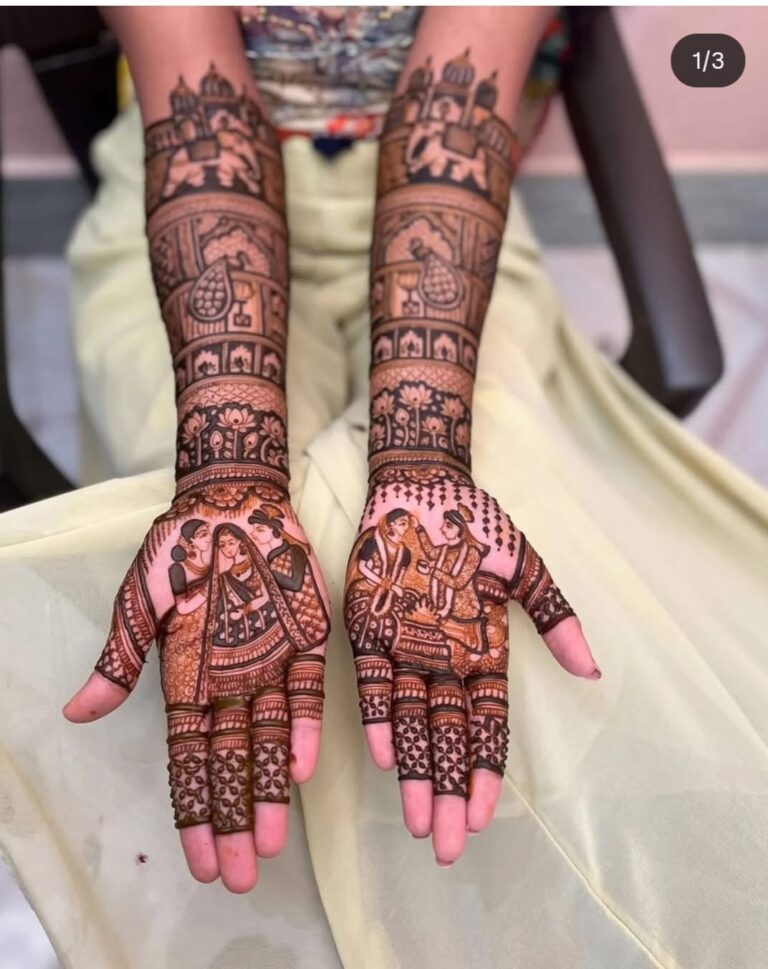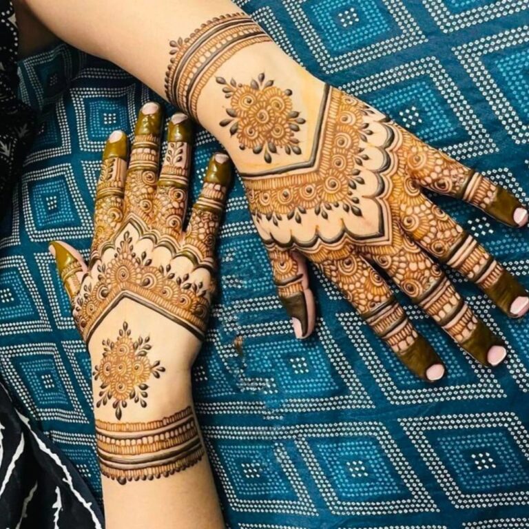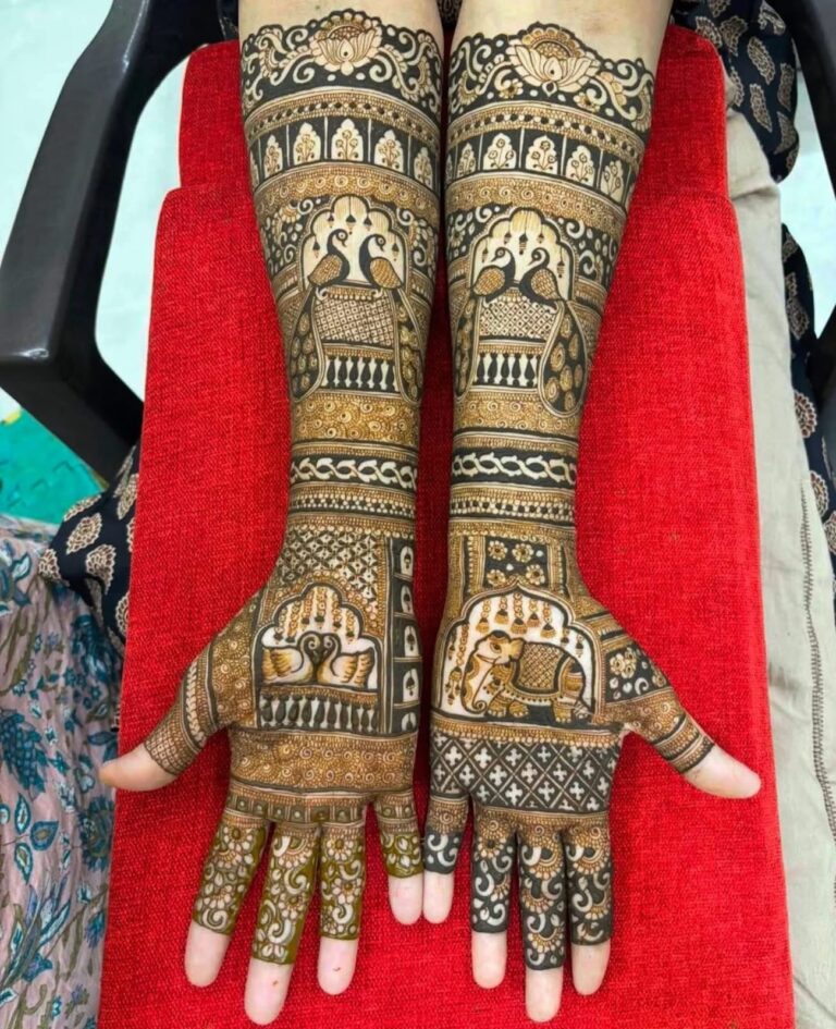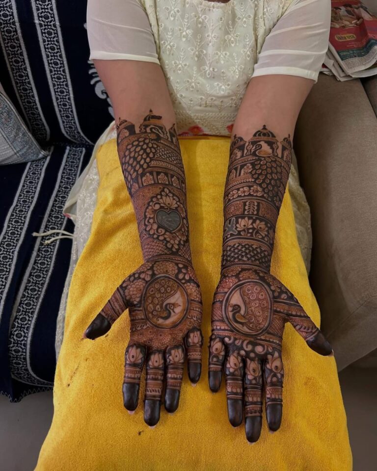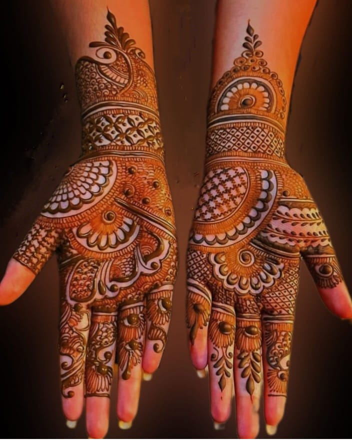 It often includes traditional motifs like paisleys, florals, mandalas, and symbolic elements. These designs cover the hands and feet beautifully, representing love, prosperity, and new beginnings.