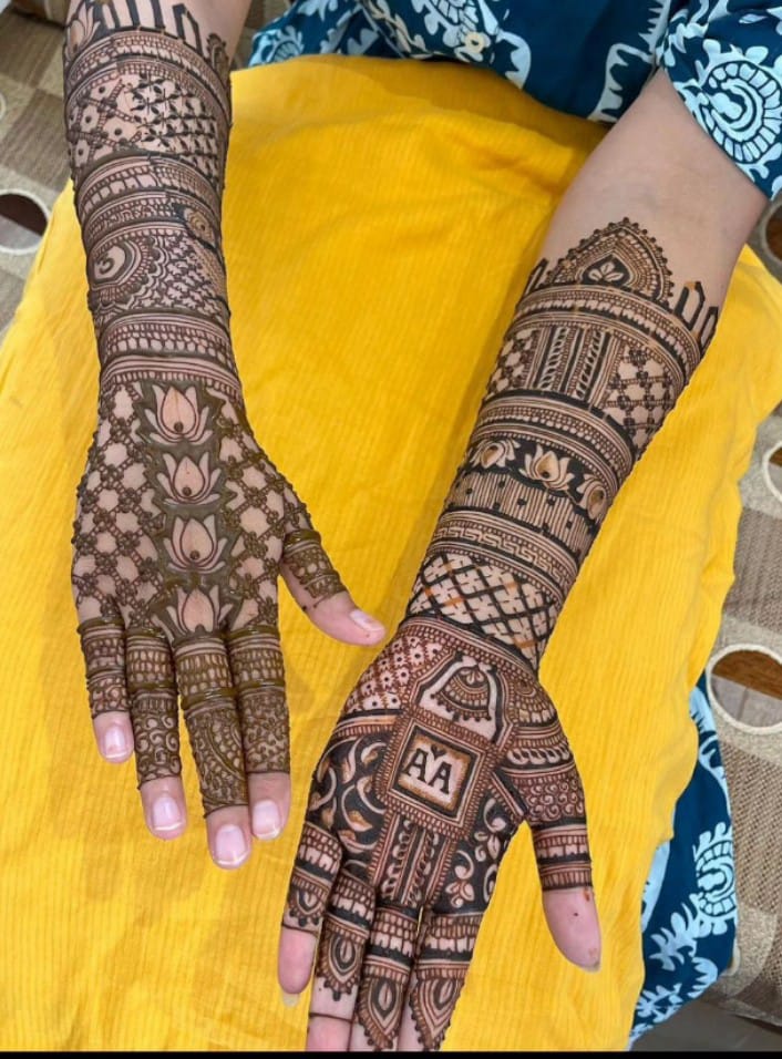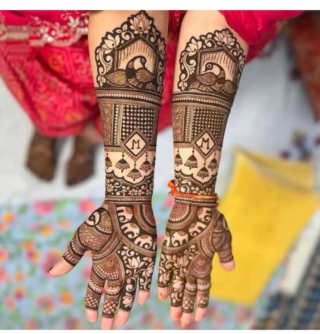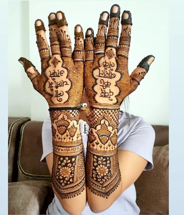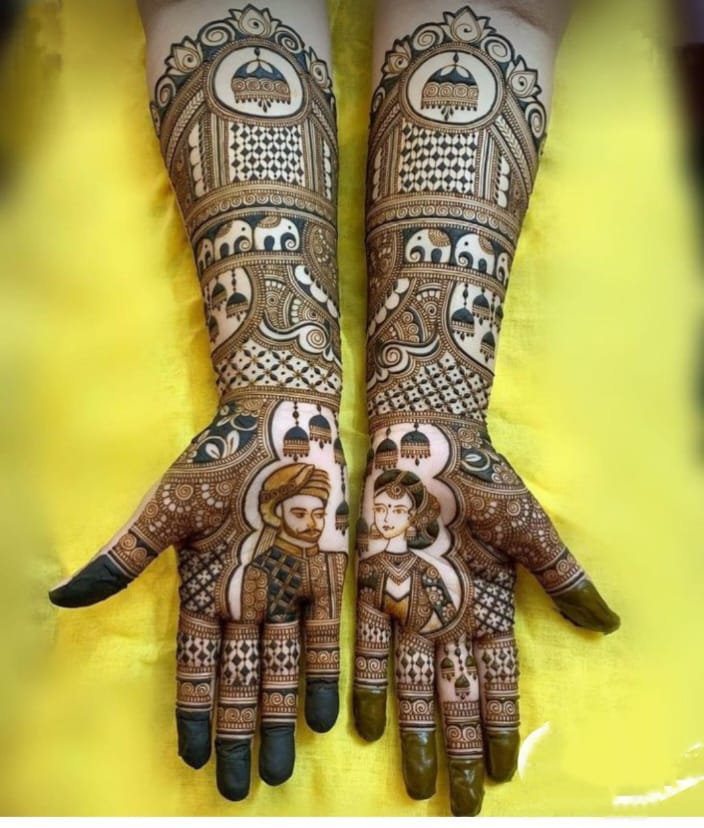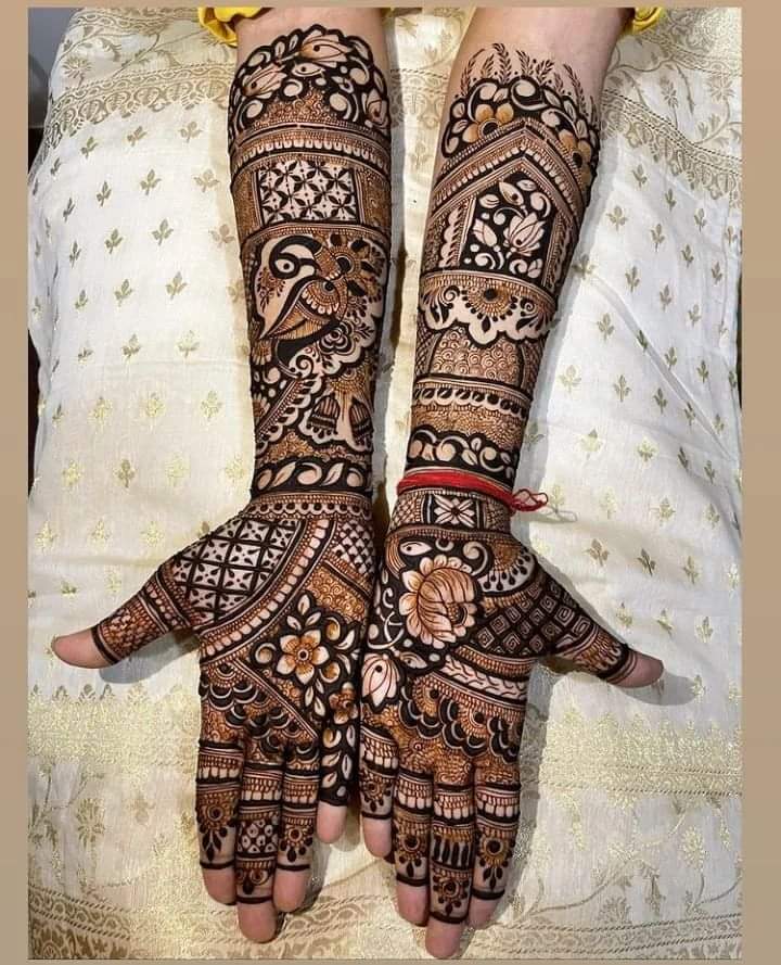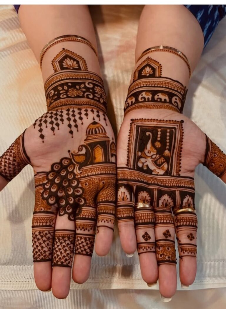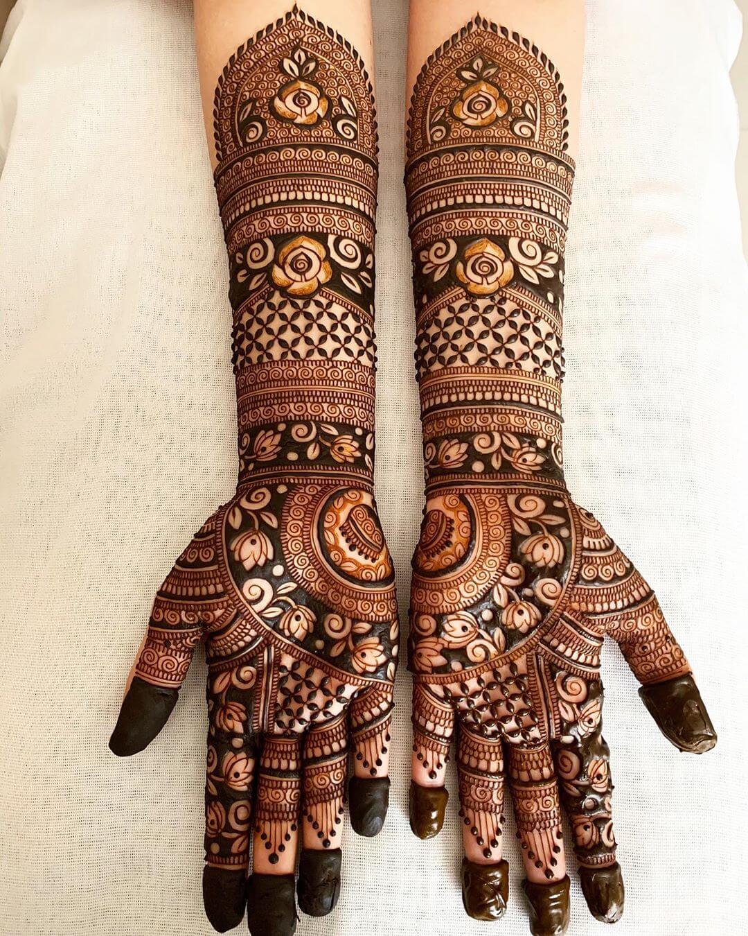It often includes traditional motifs like paisleys, florals, mandalas, and symbolic elements. These designs cover the hands and feet beautifully, representing love, prosperity, and new beginnings.