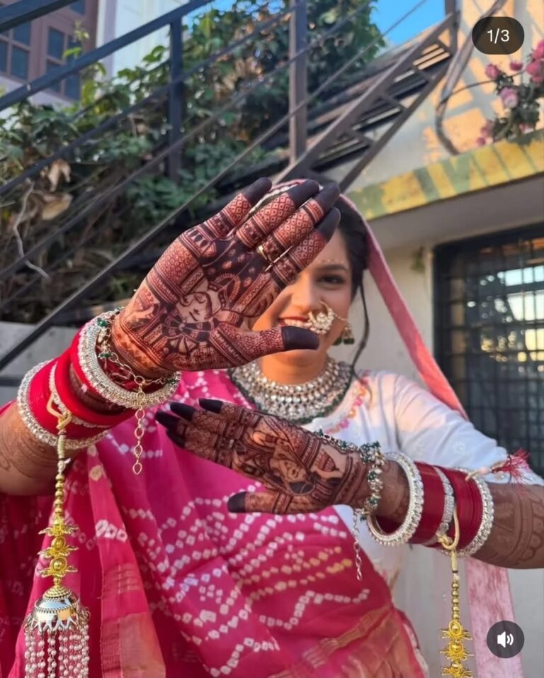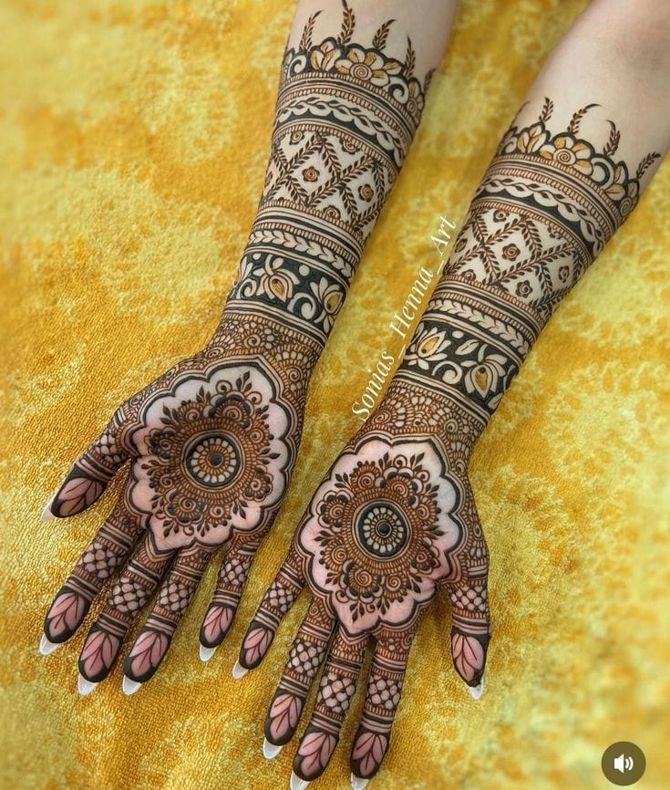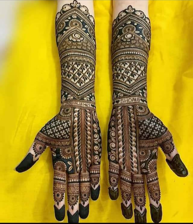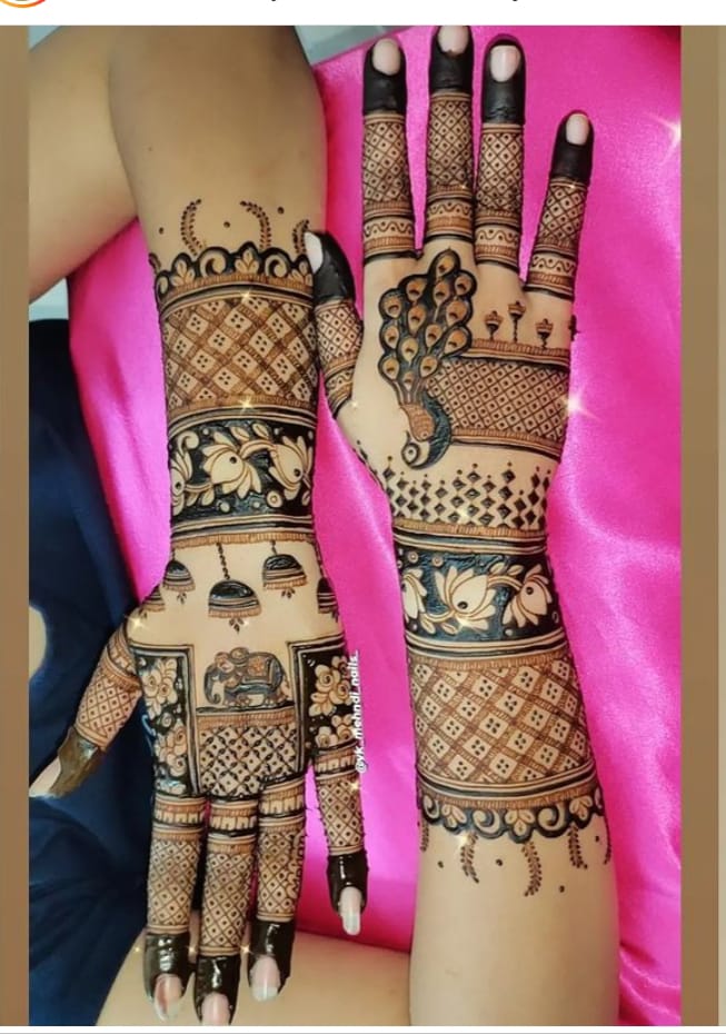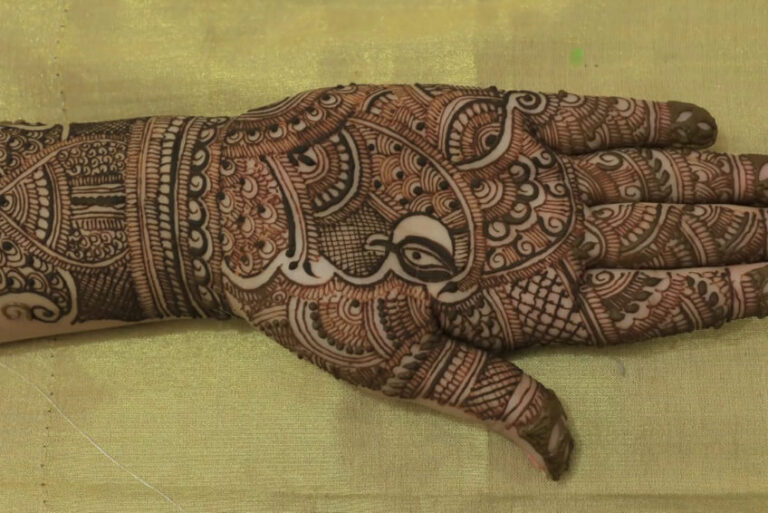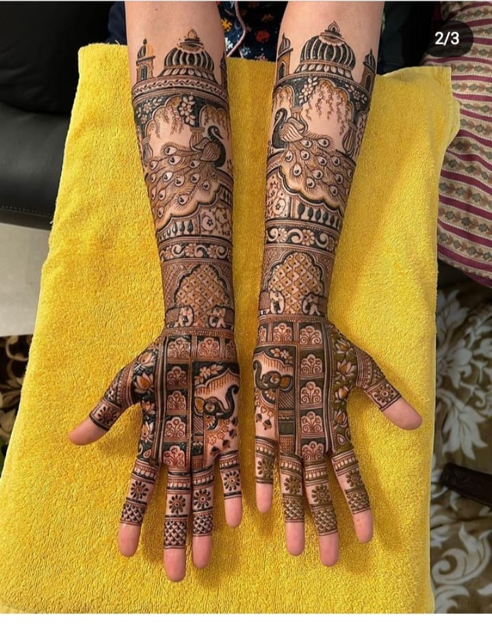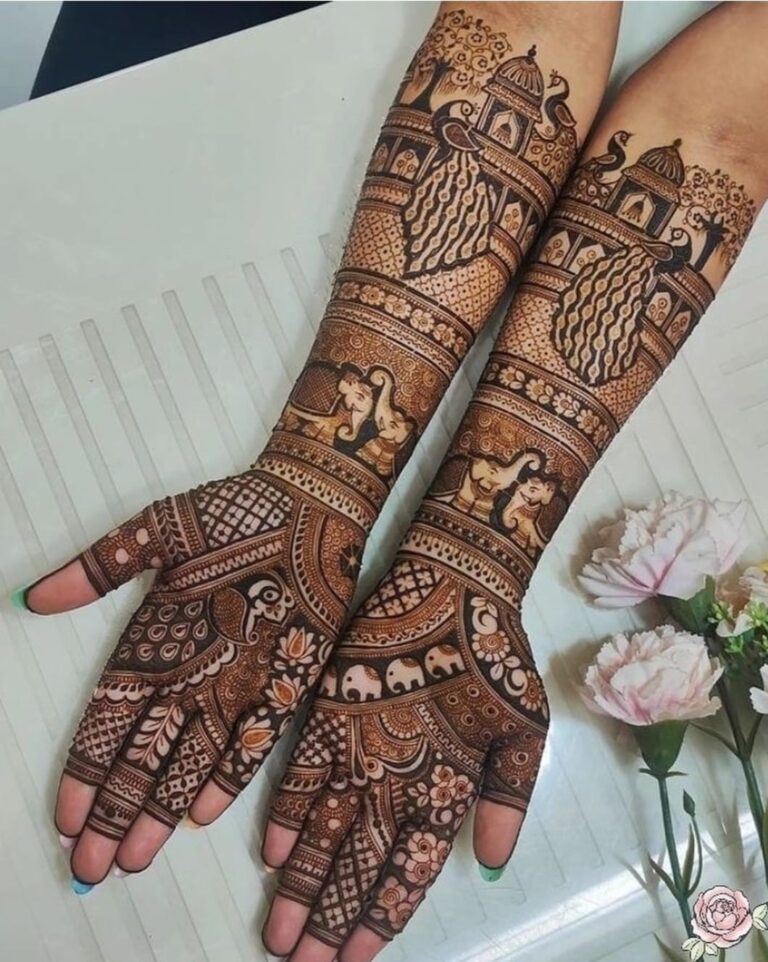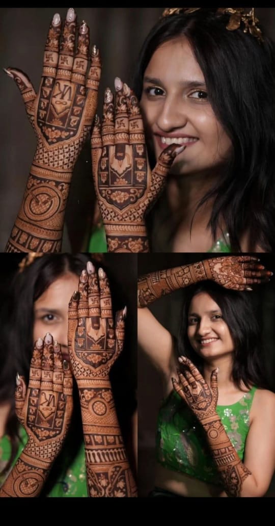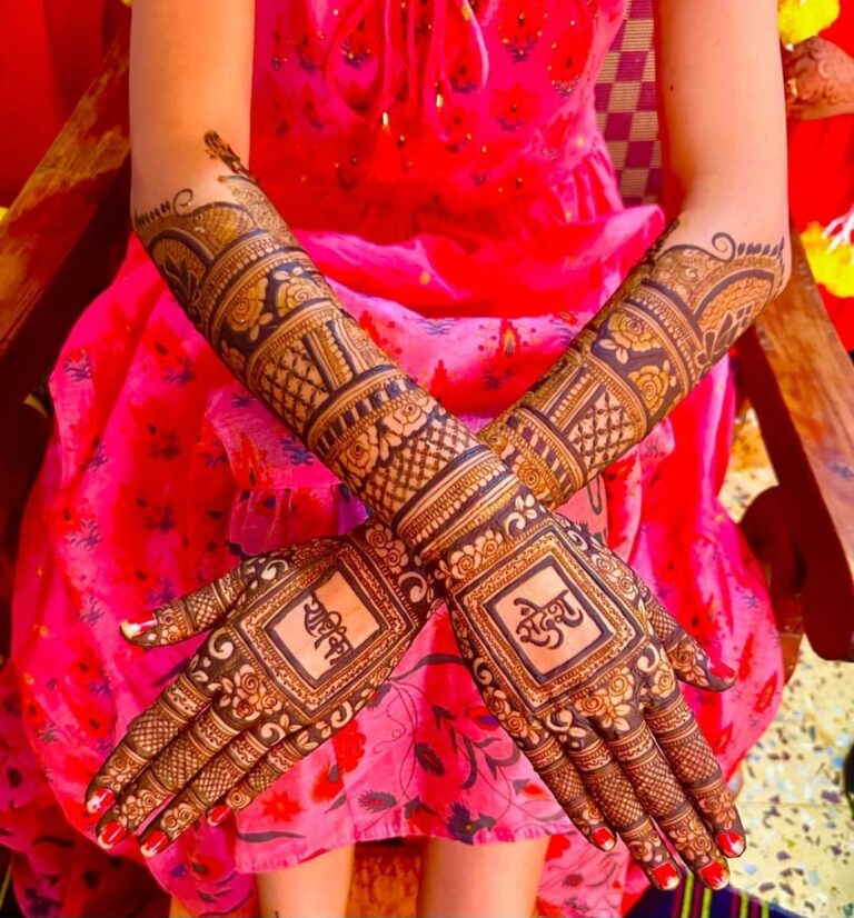 It often includes traditional motifs like paisleys, florals, mandalas, and symbolic elements. These designs cover the hands and feet beautifully, representing love, prosperity, and new beginnings.