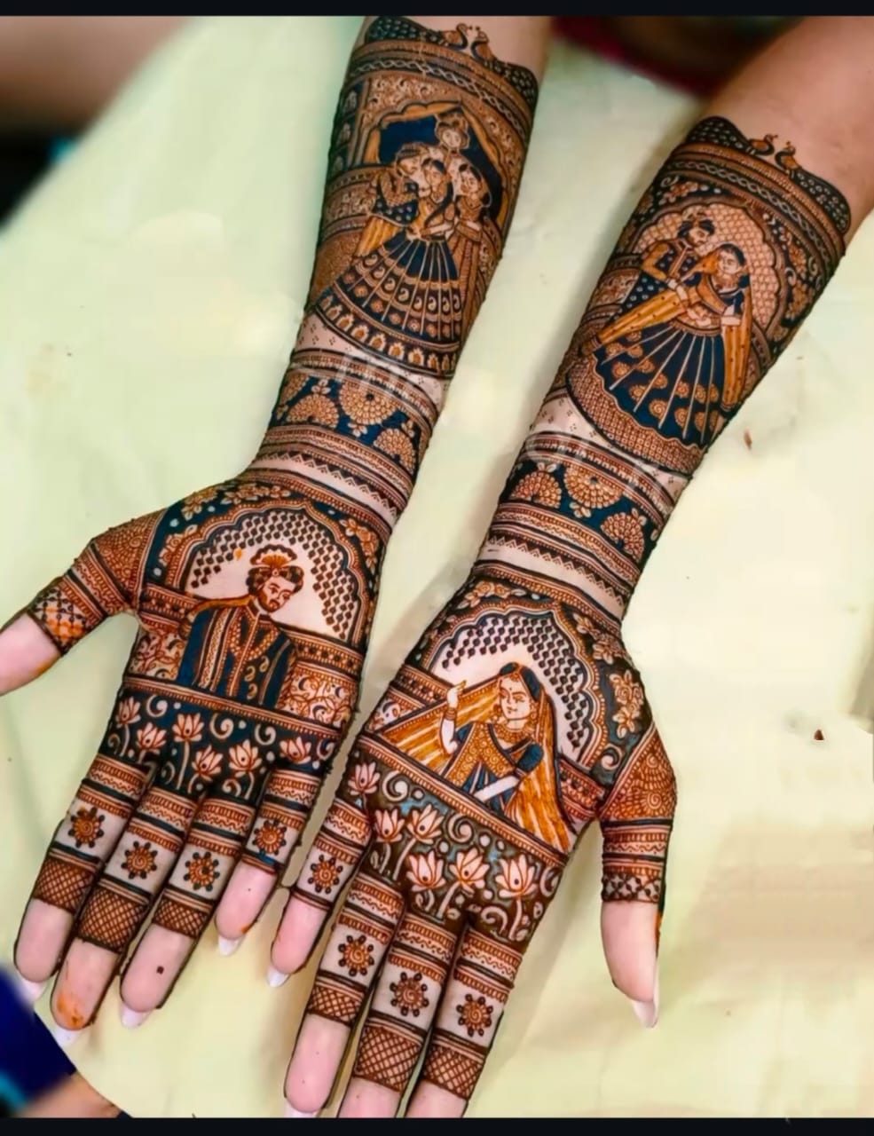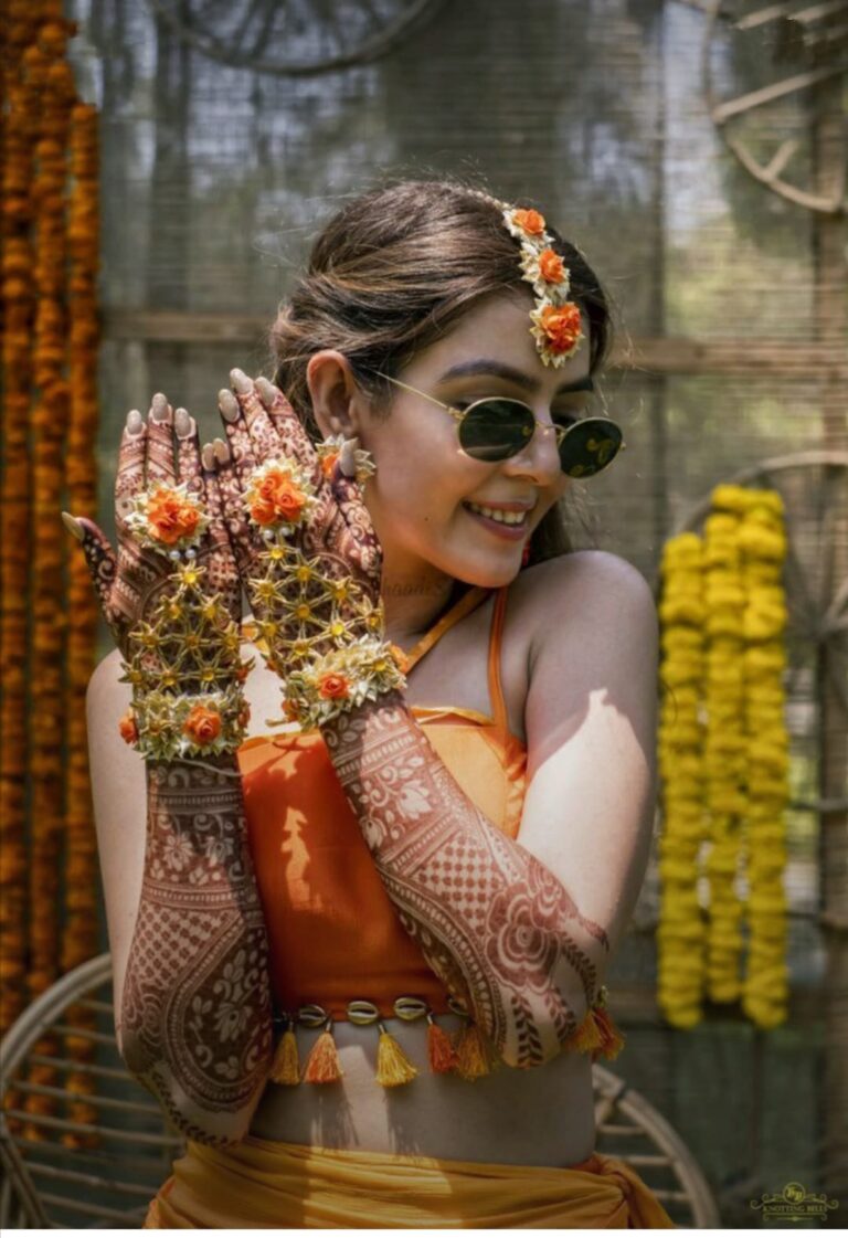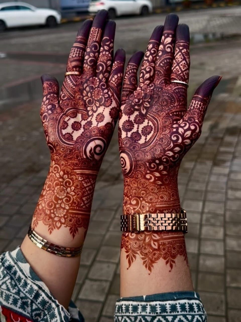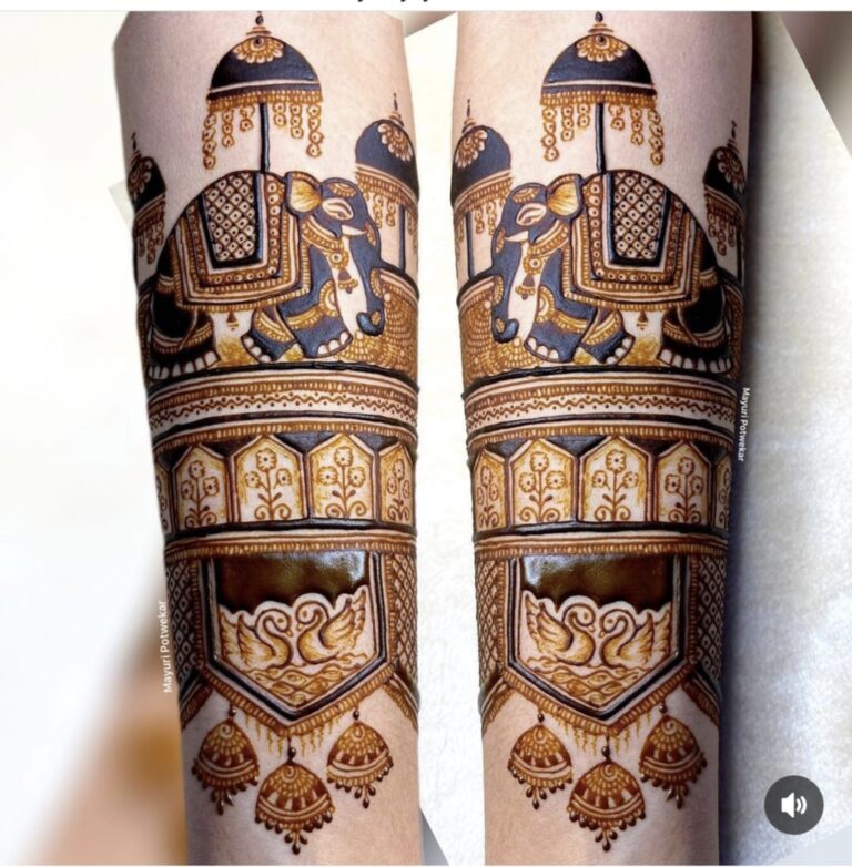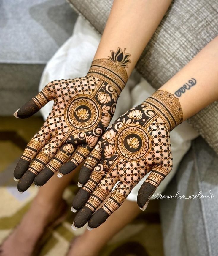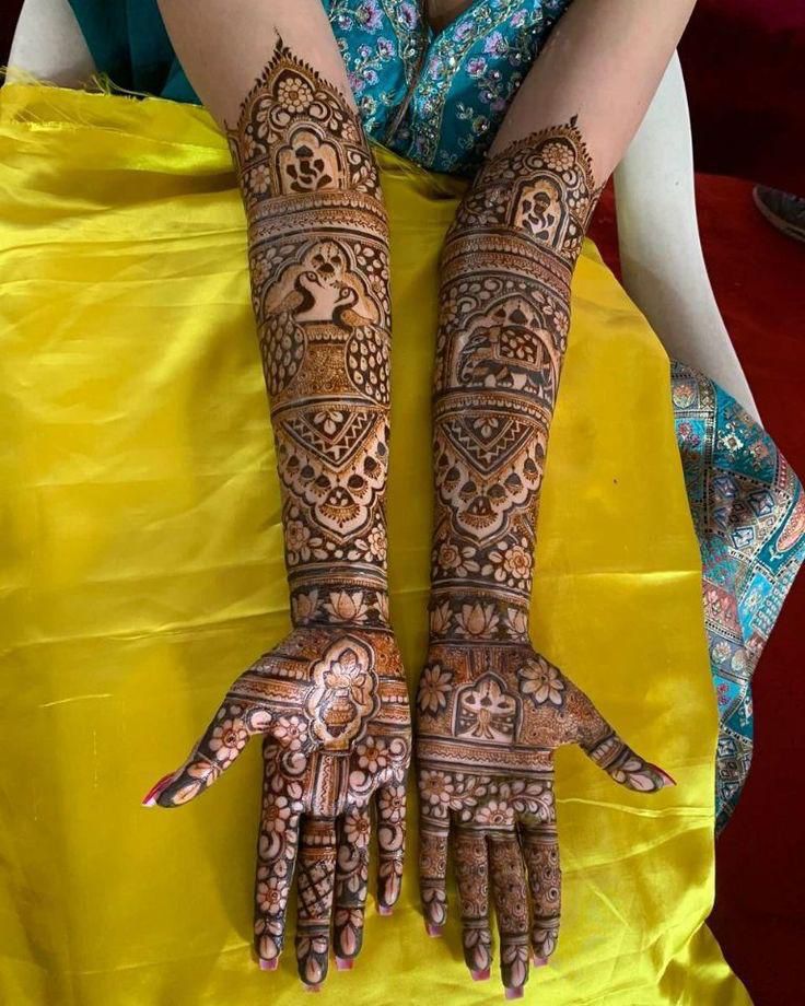 It often includes traditional motifs like paisleys, florals, mandalas, and symbolic elements. These designs cover the hands and feet beautifully, representing love, prosperity, and new beginnings.