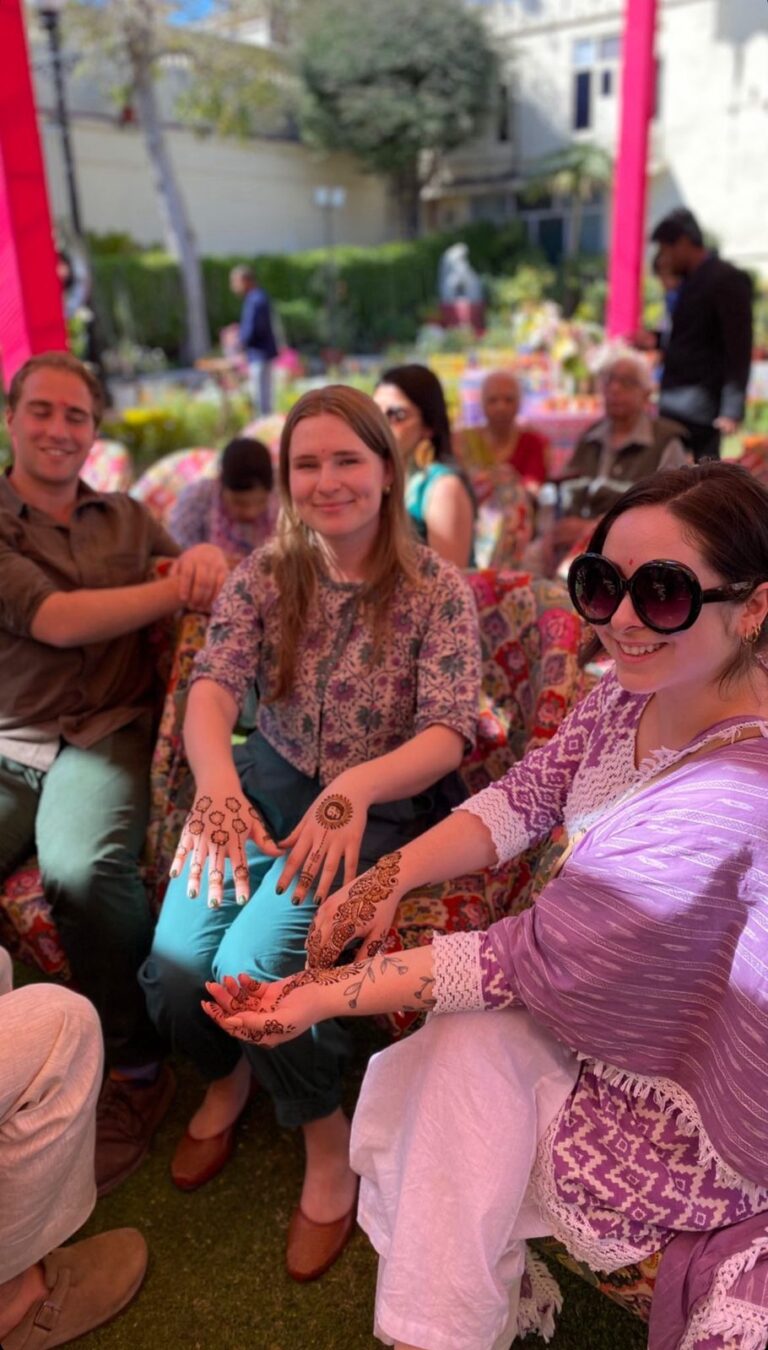 The artist team uses careful application techniques to ensure detailed and long-lasting henna results.